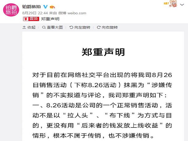 8月30日 消息:昨日,針對“涉嫌傳銷”一事,伯爵旅拍發布聲明回應稱, 8 月 26 日的活動只是一個正常的銷售活動,活動不是以“拉人頭”、“布下線”為方式與目的,更沒有用后來者的錢發放上線收益的情形,根本不屬于傳銷,也不涉嫌傳銷。
